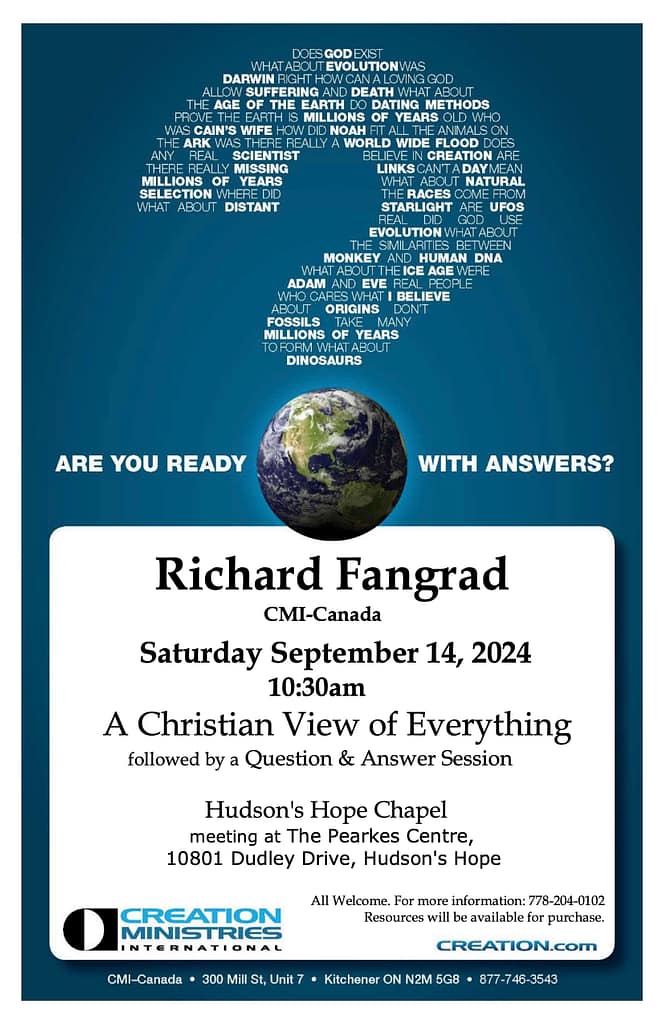 On September 14th 2024, Richard Fangard, the CEO of Creation Ministries International – Canada will be visiting Hudson’s Hope, offering a unique insight into creation, evolution, the faith, and how only the Bible ultimately provides answers to the biggest questions of life.