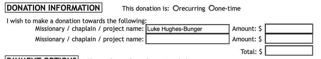 When you complete the form, please ensure the donation is directed to “Missionary / chaplain / project name: Luke Hughes-Bunger”. Cheques should still be made payable to The Fellowship.